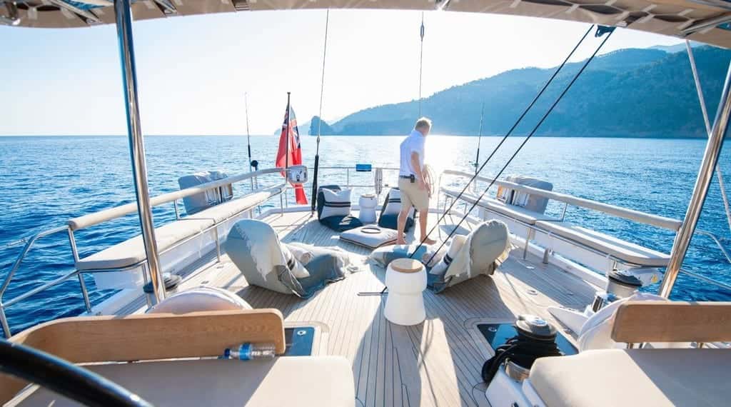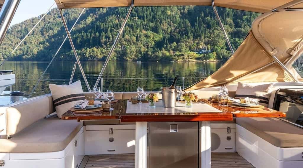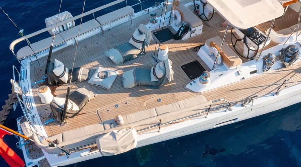 En cubierta, la gran zona de popa se convierte en el corazón de la vida a bordo. Sofás amplios, comedor exterior, nevera y barbacoa invitan a largas veladas al aire libre, degustando sabores locales mientras el sol se despide sobre las aguas tranquilas de una cala escondida. La plataforma de baño hidráulica desciende hasta el nivel del mar, creando tu propio “beach club” flotante, perfecto para zambullidas espontáneas o lanzarse a la aventura con el tender, paddle surf, e-foil o equipo de snorkel, transformando cada fondeo en un día de playa irrepetible.